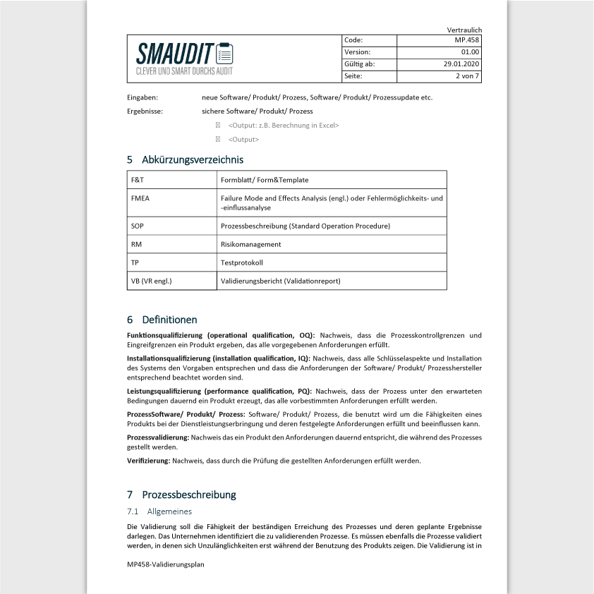 Diese Prozessbeschreibungen werden häufig SOP genannt. Sogenannte SOPs (englisch für Standard Operating Procedure) sind die Beschreibung Ihrer Standardvorgehensweise für die einzelnen Prozesse. Pläne, Nachweise oder Protokolle bedürfen in einem implementierten QMS einer Vorlage, die sogenannten Formblätter, oder auch F&T (Abkürzung für englische Forms & Templates). Diese F&Ts werden zum Ausfüllen für verschiedene Anwendungen wie beispielsweise Prüfprotokolle, Auditpläne oder Risikoanalyseberichte genutzt.